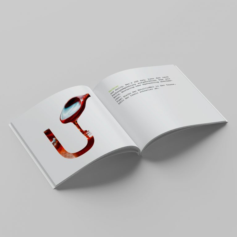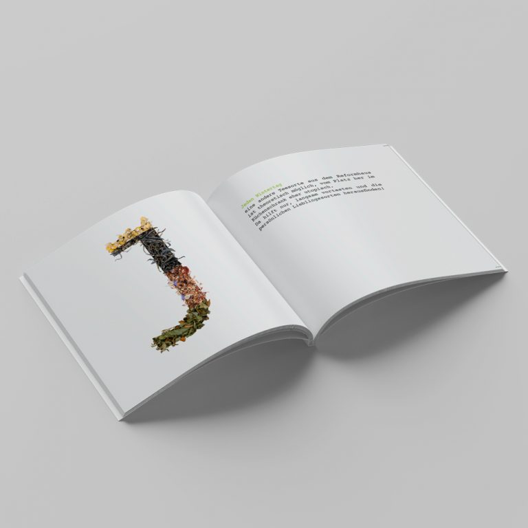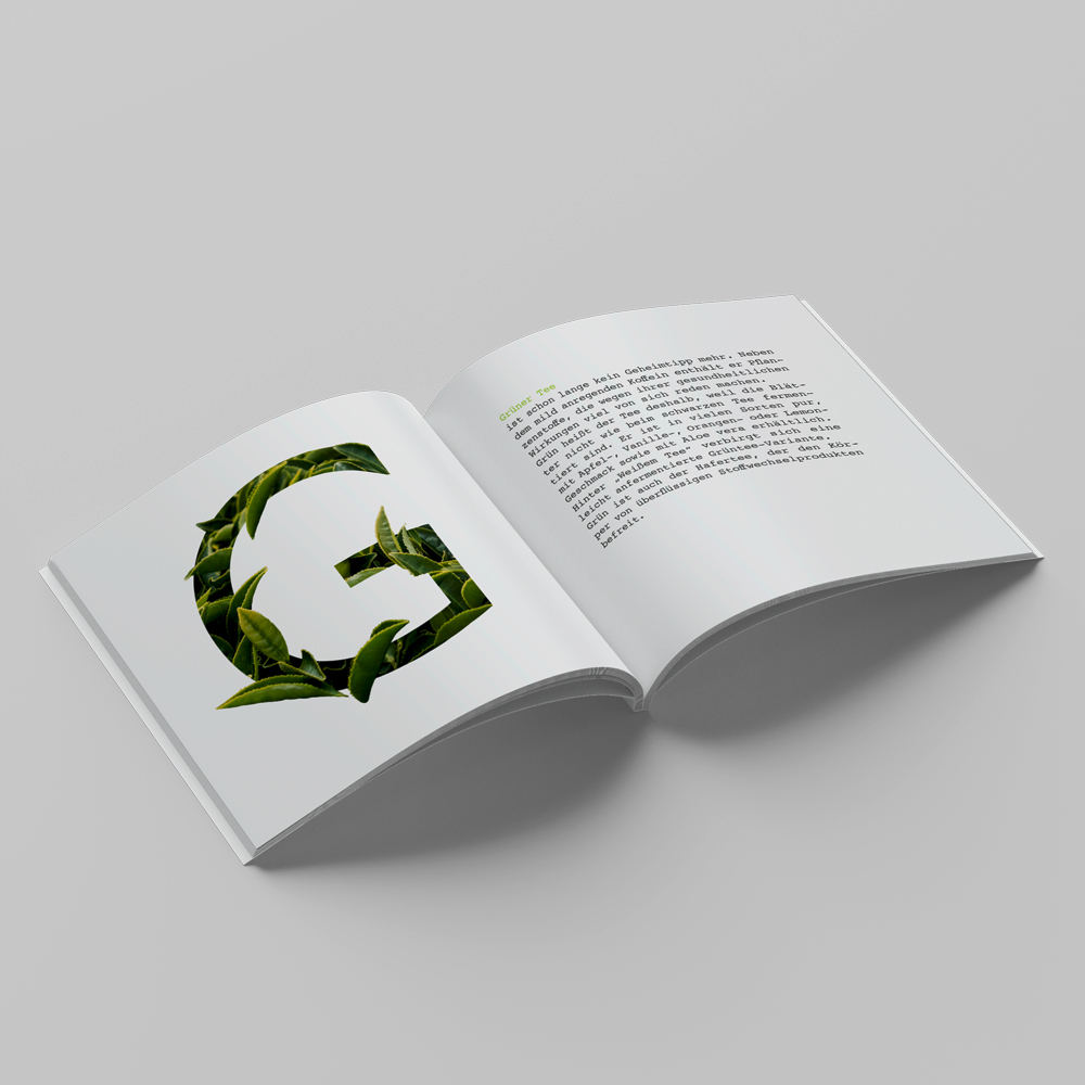 Die oben abgebildeten Auszüge sind Teil einer typographischen Aufgabe. Diese heißt „Teealphabet“. Zu jedem Buchstaben des Alphabets sollte ein vorgegebener Text gut lesbar und ansprechend gesetzt werden.